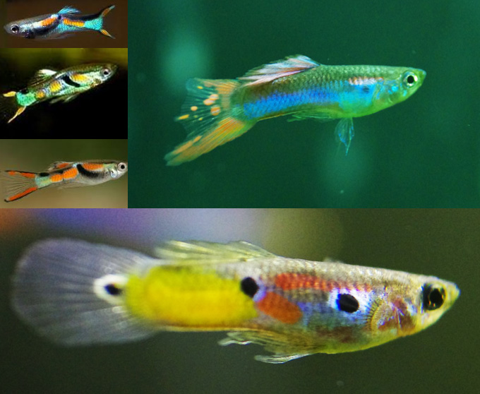 A hímek színesek, a nőstények szürkés-ezüstösek. Tenyésztésükhöz 15-20 literes akvárium legyen. Egy akváriumba 1-2 nőstényt és 2-3 hímet tegyünk. A nőstények átlagosan 23-24 naponta ellenek, egy kifejlett egyed, korától függően néhány darabtól egészen 40 feletti ivadékszámot hozhat világra. A vemhességi idő kitolódhat akár egy-másfél hónapra is. A nőstényeket, testméretüktől és tartási körülményeiktől függően 4-6 hónapos koruk után javasolt tenyésztésbe fogni. A nőstény hasa hatalmas és szögletessé válik szülés előtt, kissé idegesen úszkál majd elbújik. Az ellés néhány perctől több óráig is tarthat. A nőstényeket külön ellető medencébe, szülőketrecbe rakni nem szükséges, a legtöbb esetben csak stresszt és koraszülést okoz. Egy kisebb vízcsere, hőmérséklet emelés jótékony hatással van az ellésre. Néhány napos kortól adhatunk grindált, esetleg aprószemű haltápot, de a fő eleségük a sórák legyen. Egy hetes kortól ugyanazt az étrendet már fogyasztják amit szüleik. A hímek a törzsre jellemző mintázattól függően 3-5 hetes korban már kiszínesednek, a nőstények színe nagyjából azonos marad.