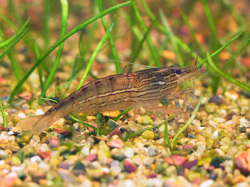 Nagy termetű: kb. 8-12 centiméter. Különleges tulajdonsága, hogy színét bizonyos mértékben a környezetéhez képest változtatni tudja. A domináns hím például vörössé válik, azonban amikor elveszíti pozícióját, visszaváltozik barnává és a nőstények talán a változó színekkel jelzik, hogy készen állnak a párzásra. Kb 5 évig él. Beszerezhetőség elég könnyű. Gyakori a kisállat-kereskedésekben. Nem teljes mértékben szaporodnak édesvízben, úgy mint az Amano garnélák sem. Szüksége van sós vízre a lárva szakaszában, annak érdekében, hogy sikeresen alakuljon ki a keltetés. Én nagyon javaslom, hogy legyen egy darab fa, kő, vagy hasonló hogy a garnéla néha kiülhessen. Ha látod hogy a garnéla szitál az akvárium alján, akkor azt jelzi hogy nem megfelelő az etetése. Feltétlenül egy nagy méretű "központi" akváriumba kell tenni, érdemes hogy a látogatók is szemügyre vehessék.